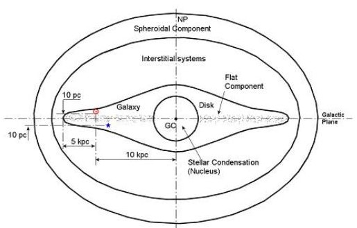 The general structure of the Galaxy is depicted in Fig. 5.a. It presents a flattened system being symmetrical relative to the basic plane called the GalacticPlane. Intersection of the latter one with the Celestial sphere gives the Galacticequator, which actually coincides with the mean line of the Milky Way.