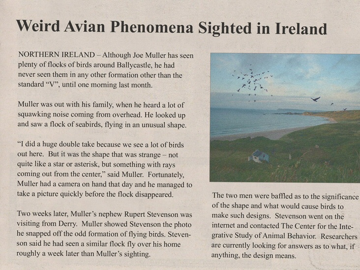 This article was scanned and emailed to me from a reader in the UK. As is easily visible, the birds appear to be flying in hyperspatial (our current dimensions plus) flock formations. As our current reality breaks down, with assistance from highly energetic light energies originating from the center of the Galaxy, the new Creation must begin to take form in the hearts of mankind.